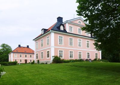 La finca Fållnäs presenta seis edificios de alas emparejados con paredes rosadas y bandas de yeso blanco en disposición simétrica.