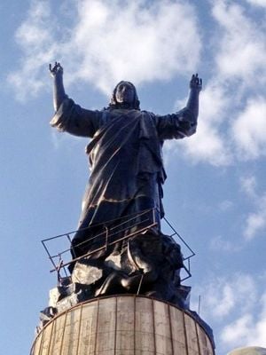 La estatua alcanza una altura total de 32 metros, con la figura central de bronce midiendo 12.3 metros, situada a una elevación de 2.100 metros.