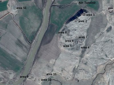 Tell Tuneinir abarca 45 hectáreas junto al río Khabur, con un montículo central que se eleva 18 metros sobre una ciudad baja circundante.