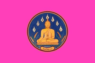 El emblema provincial incorpora imágenes budistas junto con elementos locales como el árbol Mammea siamensis y el bagre gigante del Mekong.