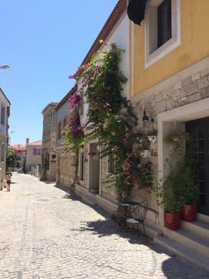 Casas de piedra con ventanas coloridas bordean las calles estrechas de Alaçatı, mientras los molinos tradicionales se alzan sobre el paisaje mediterráneo.
