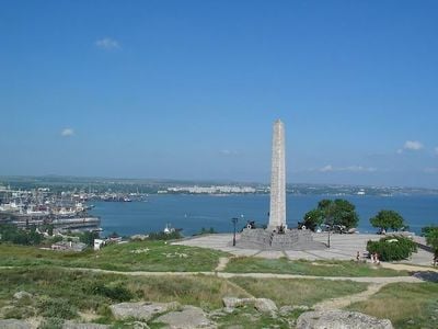 El Monte Mitrídates se eleva 91.4 metros sobre Kerch, presentando formaciones de piedra caliza y vistas del Estrecho de Kerch hacia las Montañas del Cáucaso.