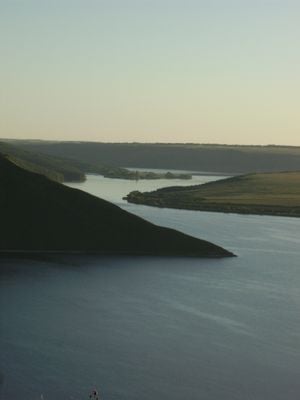 Esta bahía de 1,590 hectáreas se extiende a lo largo de acantilados de piedra caliza dentro del Parque Nacional Podilski Tovtry, rodeada de costas rocosas.