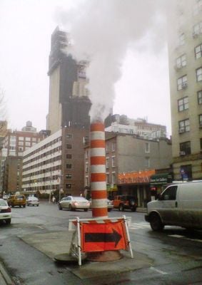 Las chimeneas de vapor naranja y blanco en las calles de Manhattan influyen en instalaciones artísticas y definen el paisaje industrial.