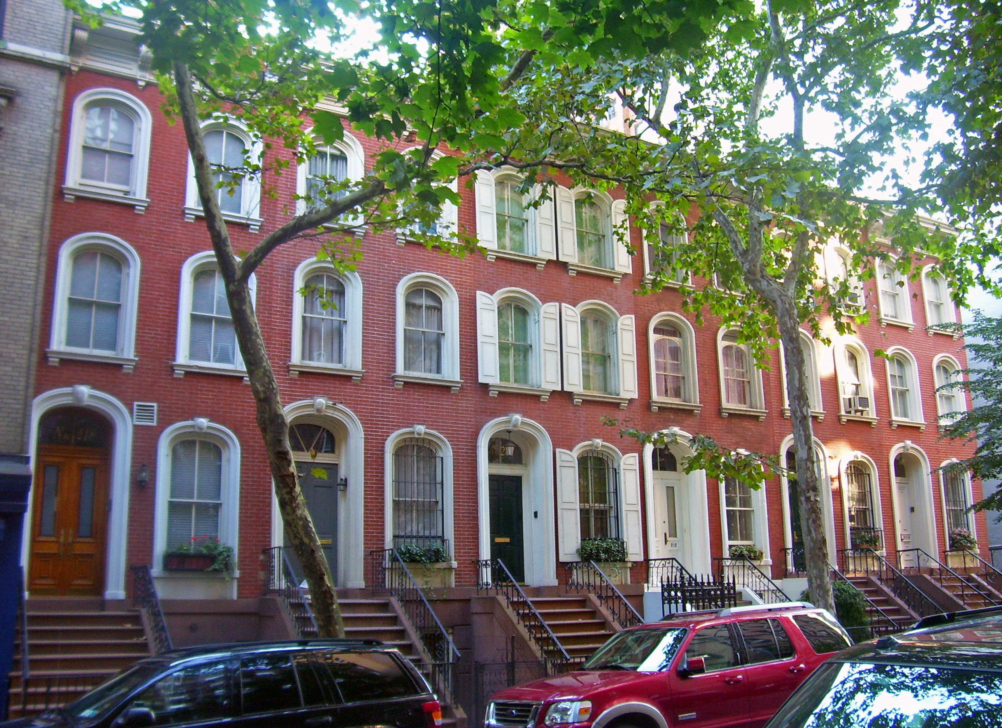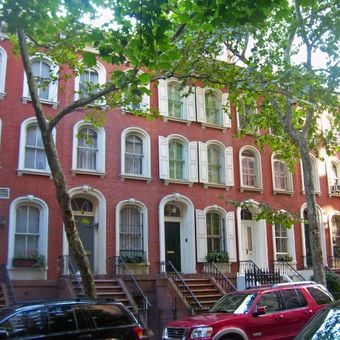Las seis casas adosadas de ladrillo en East 78th Street 208-218 presentan ventanas arqueadas y puertas con molduras decorativas en sus fachadas.