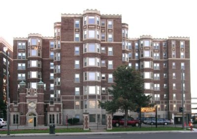 Torres Alden Park, Edificio de apartamentos Tudor Revival en el distrito East Jefferson Avenue, Detroit, Estados Unidos.