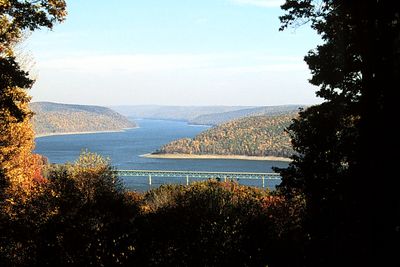El embalse Allegheny se extiende 39 kilómetros entre los estados de Pensilvania y Nueva York, cubriendo 8567 hectáreas dentro del Bosque Nacional Allegheny.