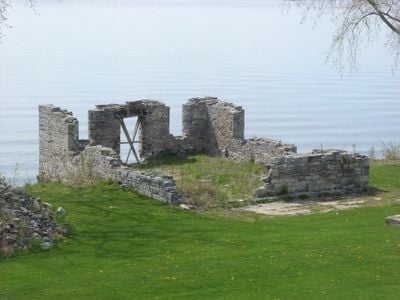 El Molino de Vapor de Aurora se levanta como una estructura rectangular de piedra en las orillas del Lago Cayuga, con tres pisos y medio de construcción.