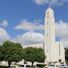 La Catedral del Espíritu Santo presenta una construcción de hormigón blanco con patrones geométricos y una alta torre campanario visible desde lejos.