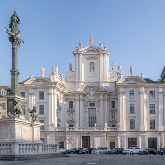 Kirche am Hof es un edificio de iglesia barroca con fachada blanca y dos torres gemelas ubicado en una plaza elevada en el centro de Viena. El interior presenta decoraciones barrocas, mientras que la amplia terraza sobre la entrada principal se abre hacia la plaza inferior.