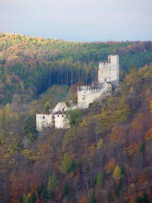 Las ruinas de Thernberg son los restos de una fortaleza en lo alto de una colina rodeada de bosque, con vistas al pueblo. Muros de piedra y cimientos de torres están esparcidos por el sitio en diferentes elevaciones, mostrando la disposición y escala del castillo.