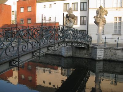 Construido en 2000, el puente exhibe esculturas de Walter De Buck que ilustran diversas leyendas de la vida del Emperador Carlos V.