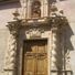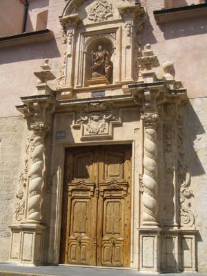La entrada lateral muestra un portal tallado en piedra por Gaspar Dies, que incorpora elementos decorativos y un nicho con la imagen de la santa.