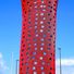 La fachada consta de dos capas distintas: una envoltura interior de aluminio y vidrio más una cubierta exterior de tubos rojos que permiten el movimiento estructural. Este sistema de doble capa permite que la torre se desplace ligeramente sin afectar los espacios interiores.