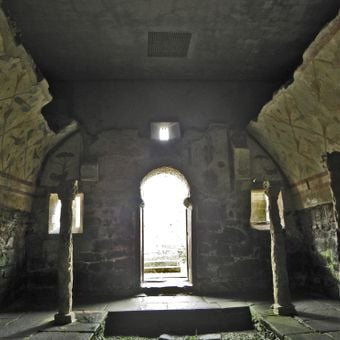 El templo presenta el arco de herradura más antiguo utilizado como elemento estructural en la arquitectura española, datado de los siglos V o VI.