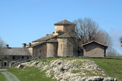 El santuario incorpora tres ábsides y naves con bóvedas de cañón, representando elementos tradicionales de la arquitectura románica del norte español.