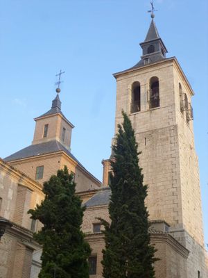 La torre presenta una aguja de pizarra al estilo madrileño con elementos específicos añadidos en 1781, como una bola, veleta y cruz.