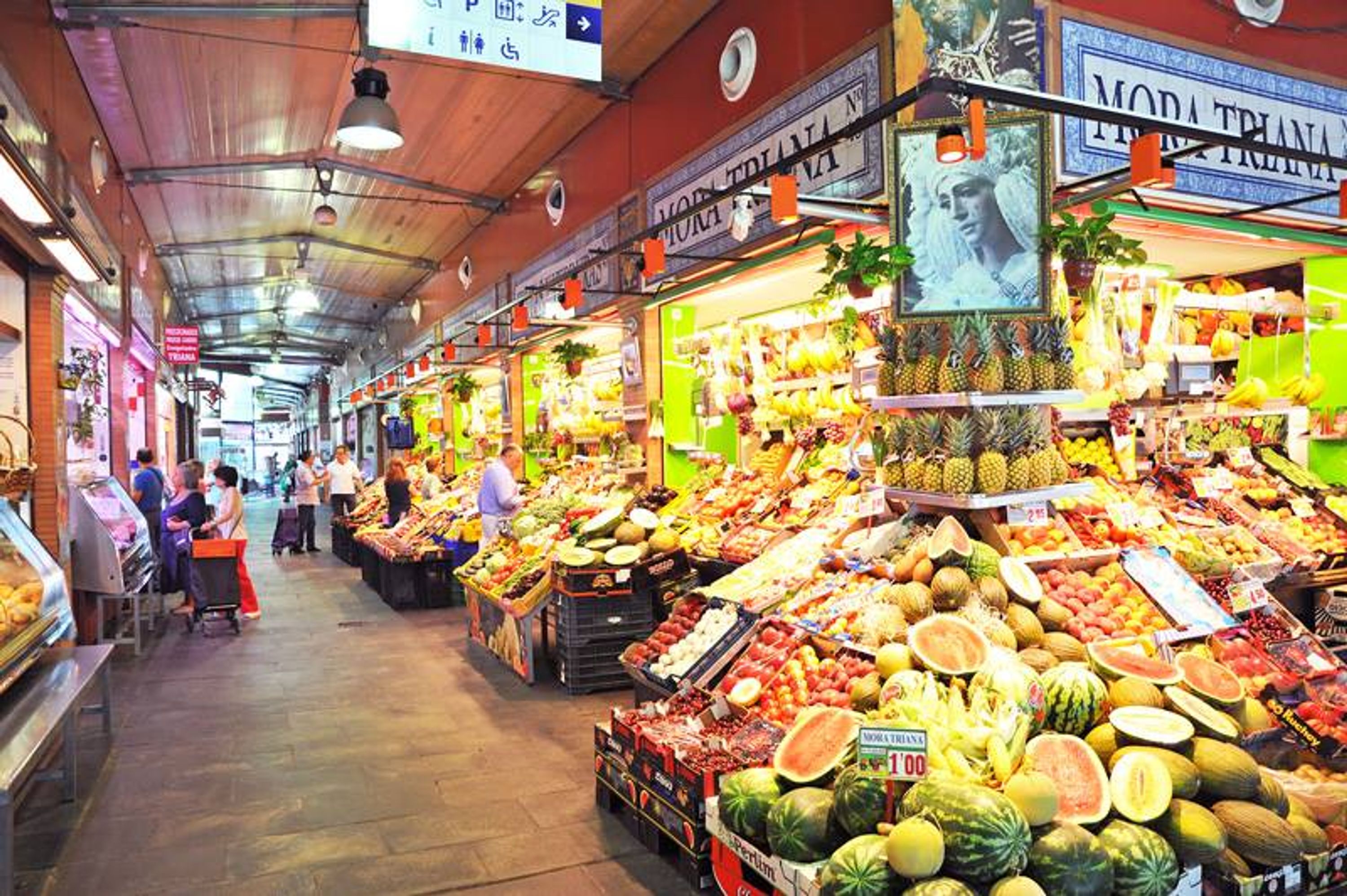 El Mercado de Triana alberga más de 100 puestos distribuidos en 4.000 metros cuadrados, ofreciendo productos frescos, pescado, carne y especialidades andaluzas.