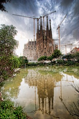 Un gran estanque reflectante espeja la fachada del Nacimiento de la Sagrada Familia, creando composiciones simétricas apreciadas por fotógrafos.
