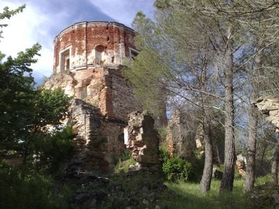 La Casa del Bosque incorpora una estructura de piedra y ladrillo, con una rotonda circular central que destaca entre los muros parcialmente derrumbados.