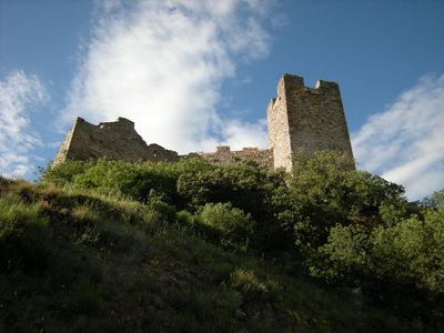 El Castillo de Cornatel se eleva sobre una formación rocosa, con almenas truncadas y murallas defensivas que se extienden por acantilados.
