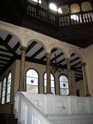 El techo de madera con forma de cúpula sobre la escalera, creado por Bernat Giner en 1554, combina elementos arquitectónicos mudéjares y renacentistas.