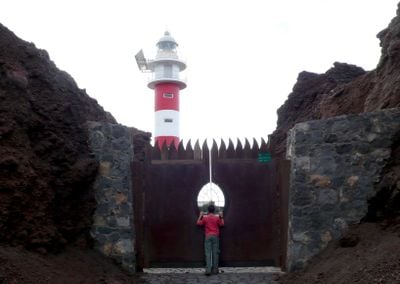 La torre cilíndrica blanca con franjas rojas se eleva 20 metros en el punto más occidental de Tenerife, orientando a las embarcaciones.