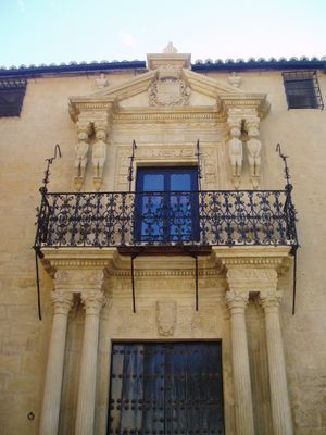 El Palacio del Marqués de Salvatierra es un edificio renacentista con fachada de piedra simétrica y columnas corintias que enmarcan la entrada. Cuatro figuras desnudas sirven como soportes para el frontón sobre la puerta principal, mientras que un elaborado balcón de hierro forjado completa la parte superior.