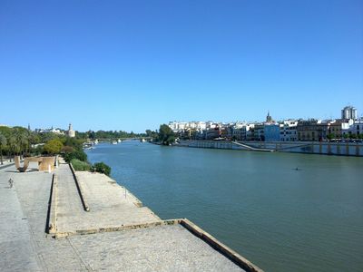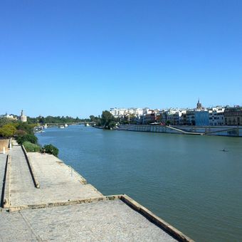 El Muelle de la Sal se extiende por el río Guadalquivir, proporcionando acceso directo al agua y vistas de las actividades fluviales.