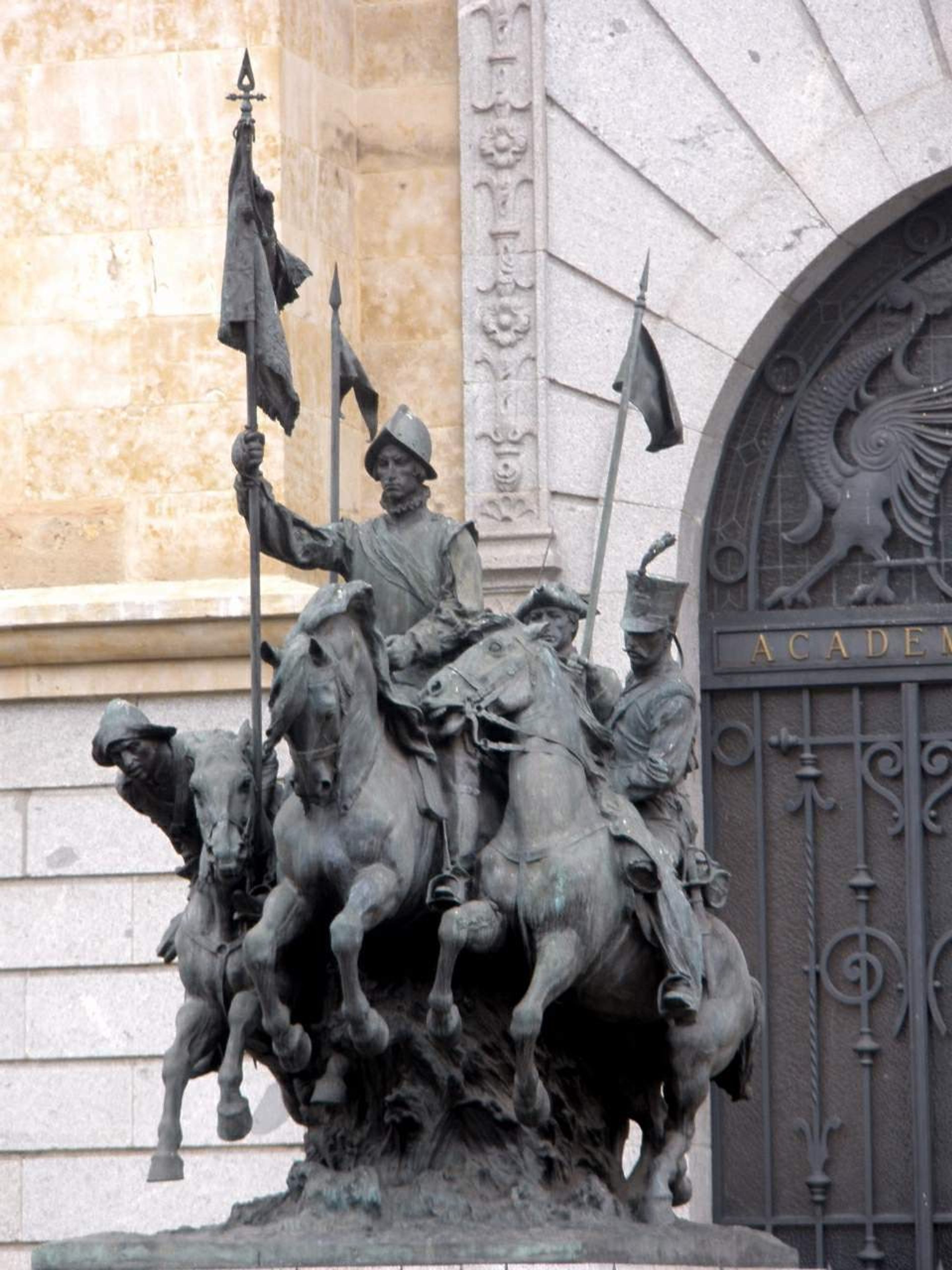 El Monumento a los Cazadores de Alcántara presenta figuras ecuestres detalladas que muestran la precisión militar de los regimientos de caballería.