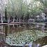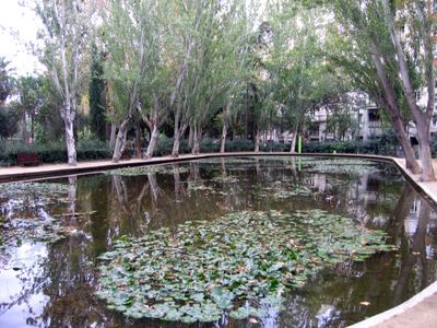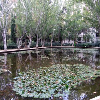 Un estanque central se llena de nenúfares durante los meses de verano, creando un espectáculo natural rodeado del paisaje urbano de Barcelona.