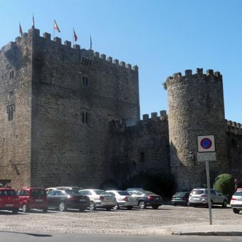 La fortificación gótica presenta torres de piedra, muros robustos y estructuras defensivas ubicadas en la parte baja de Arenas de San Pedro.
