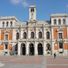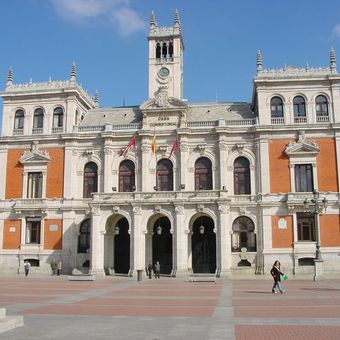 El Ayuntamiento de Valladolid de tres plantas presenta elementos decorativos elaborados y detalles arquitectónicos detallados en su fachada de piedra.