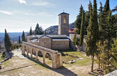 El monasterio se encuentra a aproximadamente 1.190 metros de altura cerca del pico Cancho Gordo, lo que resulta en temperaturas más frescas y condiciones climáticas variables. Su ubicación remota en una meseta de montaña requiere calzado firme y resistencia para una visita completa.