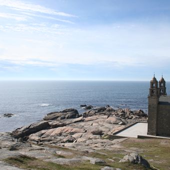 El Santuario de la Virxe da Barca se alza junto al mar, presentando muros de piedra y elementos ornamentales propios de la arquitectura religiosa.