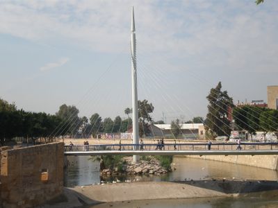 La Pasarela del Malecón es un puente peatonal sobre el río Segura con un diseño característico de mástil de acero. Conecta el barrio del Carmen con el centro de la ciudad y funciona como un punto de paso importante en el paseo ribereño renovado.