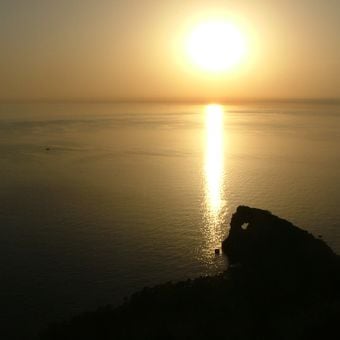 Sa Foradada se adentra en el Mar Mediterráneo con acantilados escarpados y presenta un arco natural a través de su promontorio rocoso a 39.7561°N.