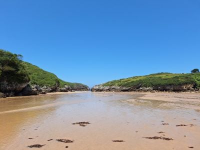 La playa presenta arena blanca que se extiende a lo largo de una cala estrecha formada por el río Vallina, que fluye por su margen derecho.