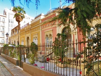 El pasaje muestra una combinación de elementos arquitectónicos clásicos con detalles decorativos orientales que refleja el eclecticismo romántico del siglo XIX. Este enfoque de diseño caracteriza la apariencia de cada casa a lo largo del camino.