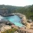 La playa de 30 metros combina arena blanca con guijarros y grava, rodeada por acantilados de piedra caliza en la costa balear.