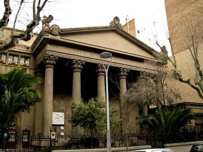 El Taller Masriera presenta una fachada neoclásica con columnas y frontón, elevándose como estructura templaria en la calle Bailén 70-72 de Barcelona.