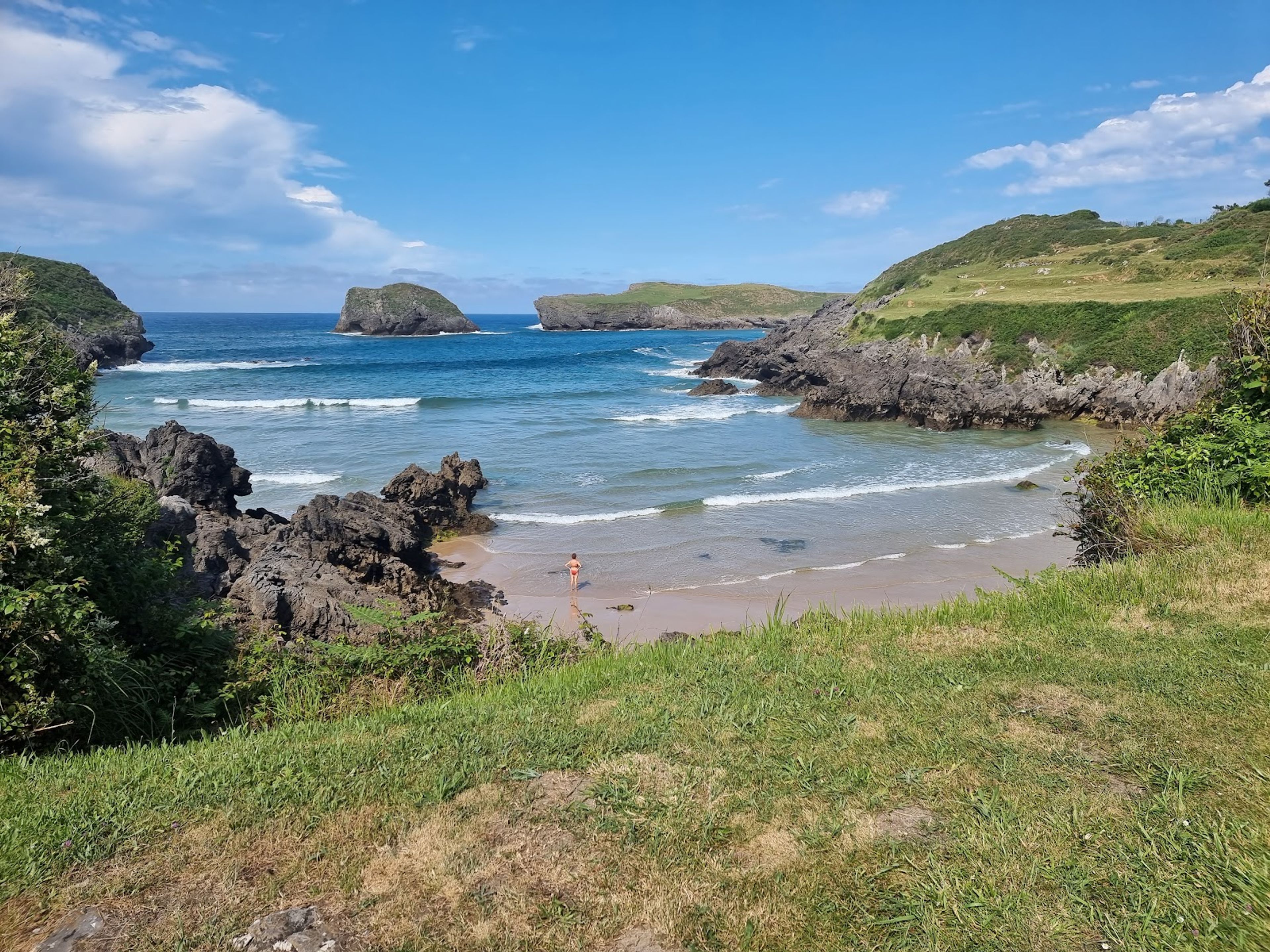Tres playas conectadas se extienden por la costa oriental asturiana, con arena blanca fina mezclada con secciones rocosas y formaciones naturales.