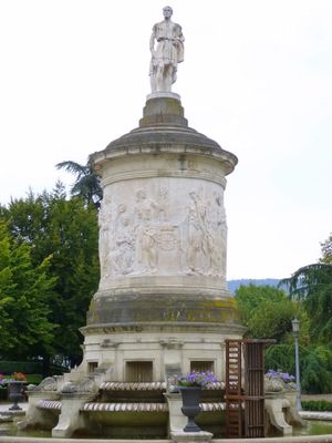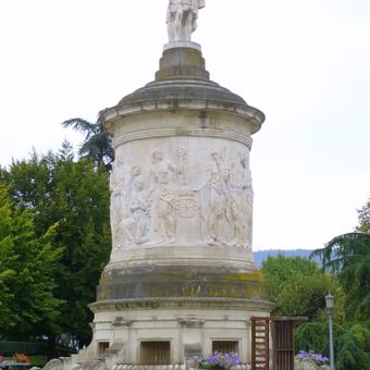 El monumento presenta un pedestal cilíndrico con una base de fuente adornada con catorce figuras en relieve que ilustran la vida de Gayarre.