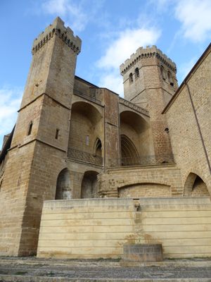 La construcción de la iglesia comenzó en 1094, con ampliaciones hasta el siglo XIV cuando el Rey Carlos II añadió elementos de fortificación.