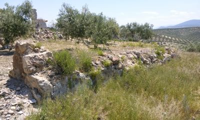 Castillo de La Iglesia, restos de torreón medieval, muralla, aljibe y era, en un cortijo de la campiña jiennense, término municipal de Torredelcampo, España