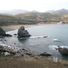 La orilla arenosa se extiende 460 metros a lo largo de la costa, con una mezcla de arena gruesa y guijarros contra un fondo montañoso.