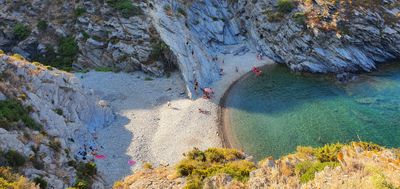 La playa se compone de guijarros y grava que se extienden 50 metros de largo y 15 metros de ancho junto al Mar Mediterráneo.