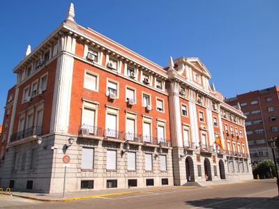 El edificio de cinco plantas presenta un frontón triangular y combina sillería y ladrillo en su diseño arquitectónico neoherreriano en Avenida de los Reyes Católicos 4.