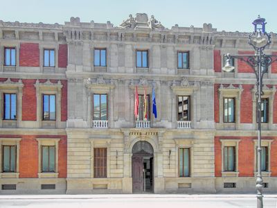 El edificio del Parlamento de Navarra se encuentra en Calle Navas de Tolosa 1, con elementos neoclásicos y una fachada con esculturas decorativas.