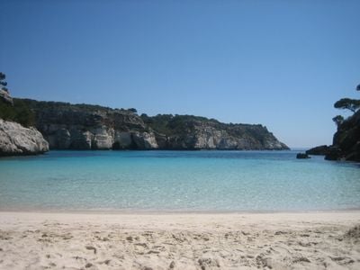 Cala Macarelleta, Playa de arena blanca y playa nudista en Ciutadella de Menorca, España